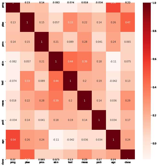 sns.heatmap(cor, annot=True, cmap=plt.cm.Reds)