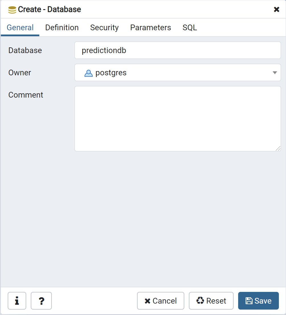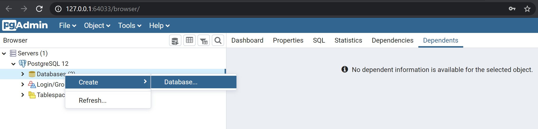 Ensure that you have PostgreSQL 12+ installed. Check the official PostgreSQL download section if possible. I used the pgAdmin which comes with official windows download, to create a new empty database called 'predictiondb'. Note that the first time pgAdmin opens up in your browser you would need to specify a default user and password. You may add 'postgres_user' as the user and 'postgres_password' as the password.