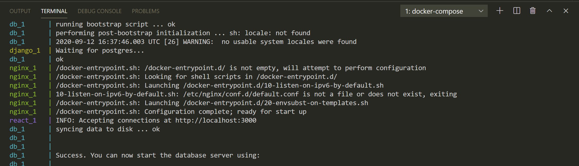 Now from your command line go our main project folder 'DockerDjangoReactProject' and run the command 'docker-compose up' or 'docker-compose up --build'.