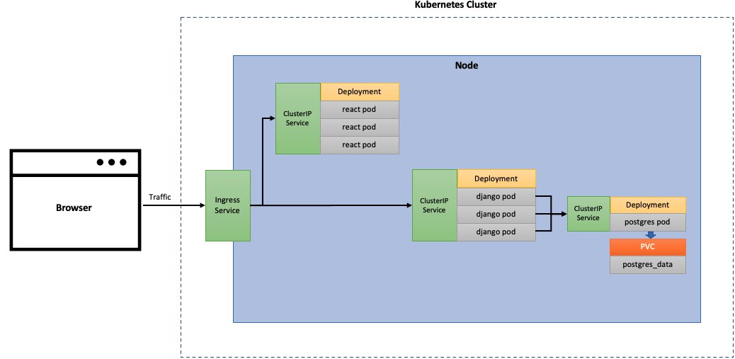 The React deployment would create the frontend from where the end-users can interact with our application. Like before, this would also have a ClusterIP Service. The ClusterIP would allow the Ingress to divert incoming traffic to the frontend. Again we do not need a volume to host the static assets. We would store the static assets with the app itself. With the React container, we would use the 'serve' server as we did with docker-compose. The 'serve' server can serve static assets. Just like with Django, we have the option to store the static assets externally or use a CDN for better performance.
