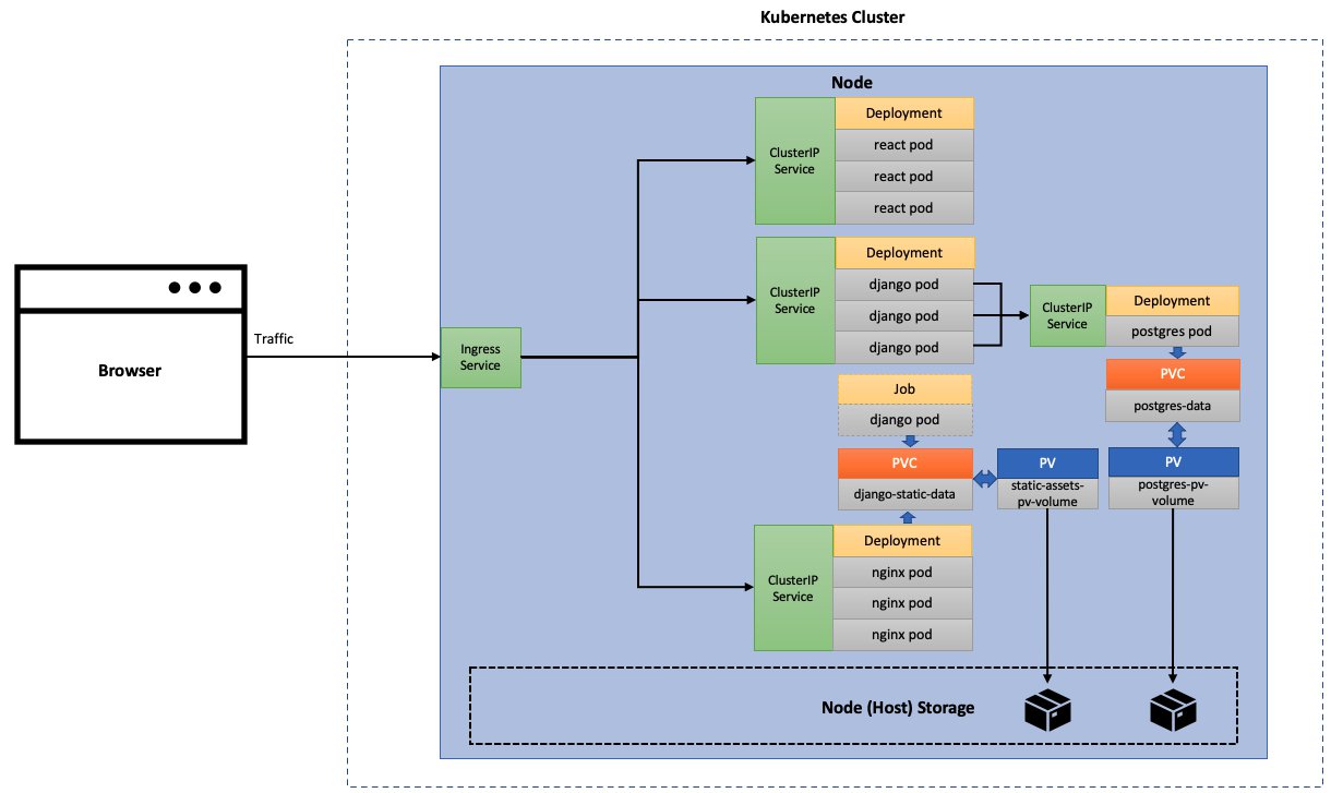 The Ingress Service would essentially be doing what our Nginx server was doing before. This would take web traffic from outside the node and route the traffic to the respective applications. If we store the static assets of our application externally then the Ingress service would need to route to these static assets as well.
